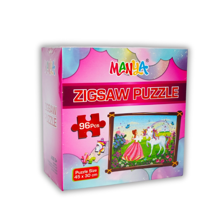 Step into a magical world with the Manya Zigsaw Puzzle – Fairy Tale Edition! This 96-piece puzzle features a beautiful princess and a majestic unicorn in an enchanting landscape, making it the perfect puzzle for kids who love fantasy and fairy tales.